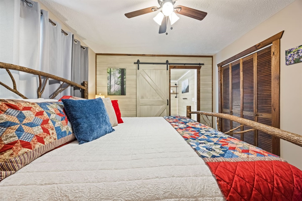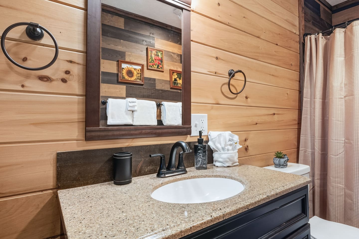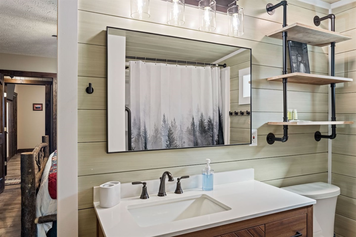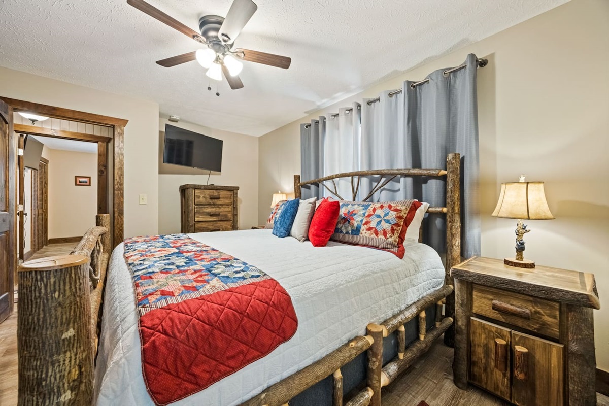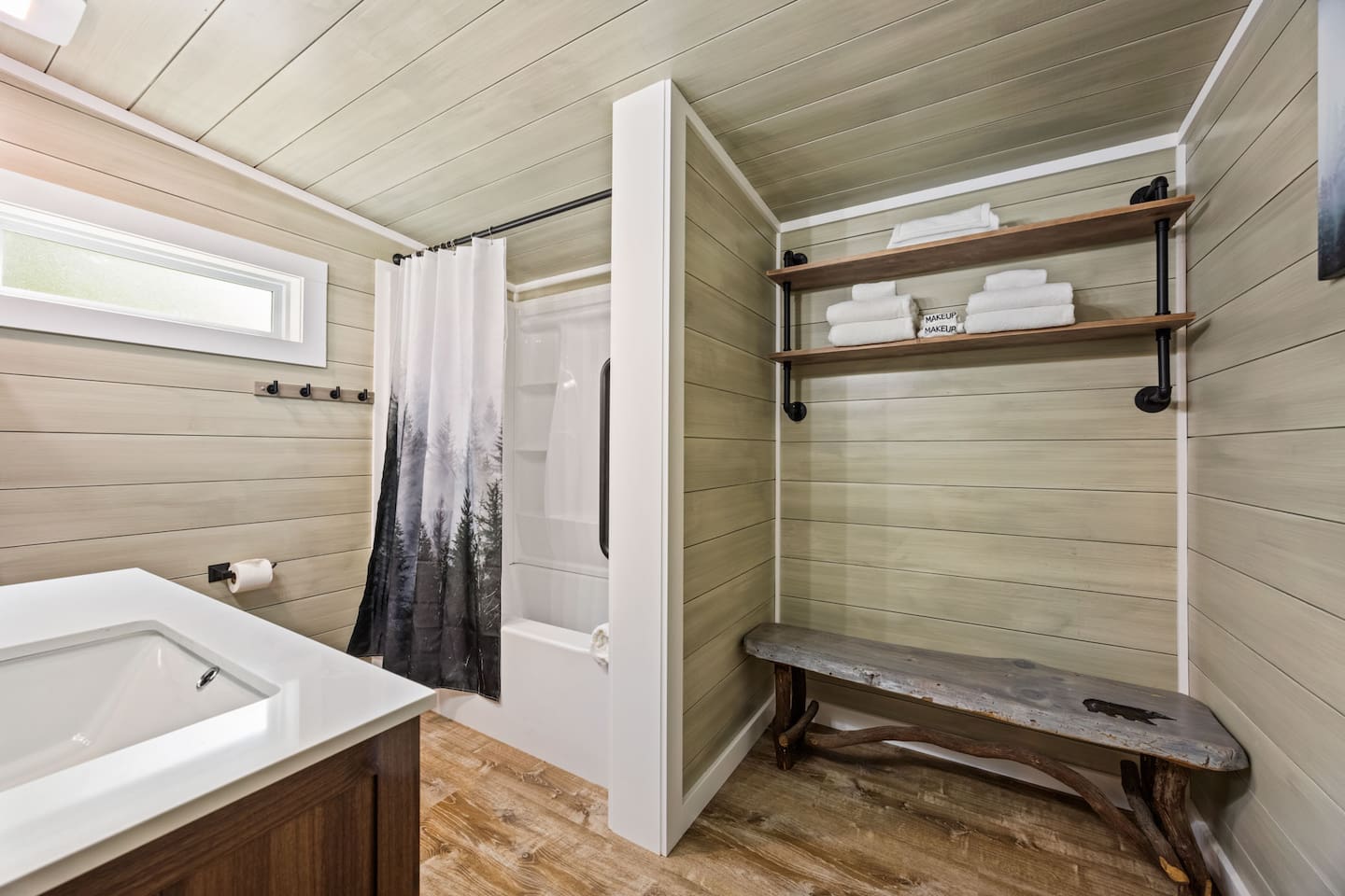 **Bedroom:** The primary bedroom features a rustic King bed, blackout curtains for restful sleep, a TV, and a private ensuite bathroom with a tub/shower combo.