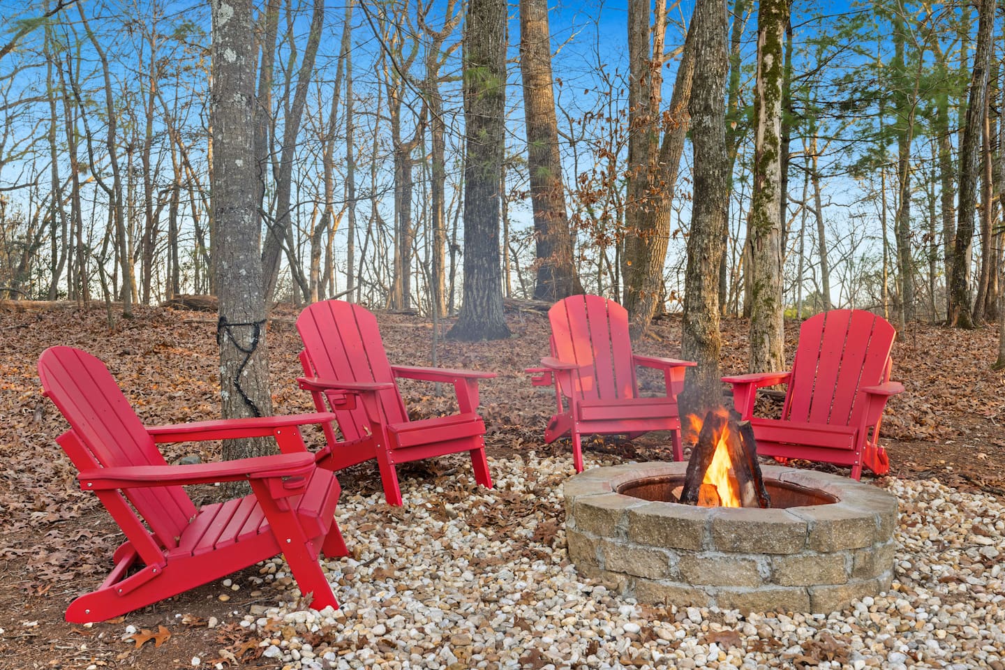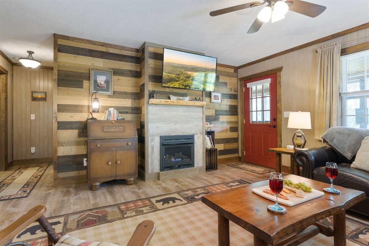 **Living Room:** Comfortable seating, gas fireplace (available October-April), and a 55” Smart TV with Netflix and GoogleTV.