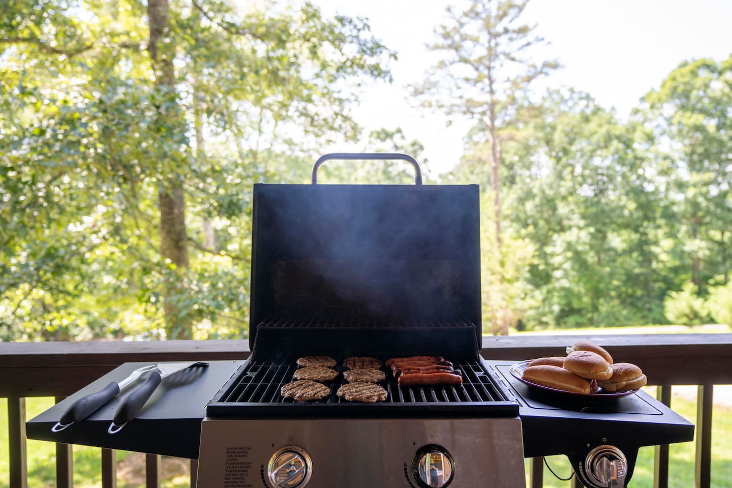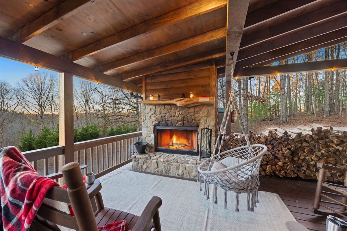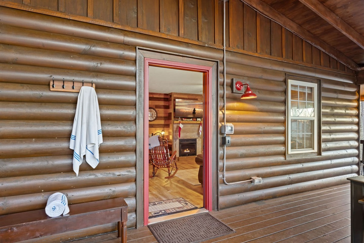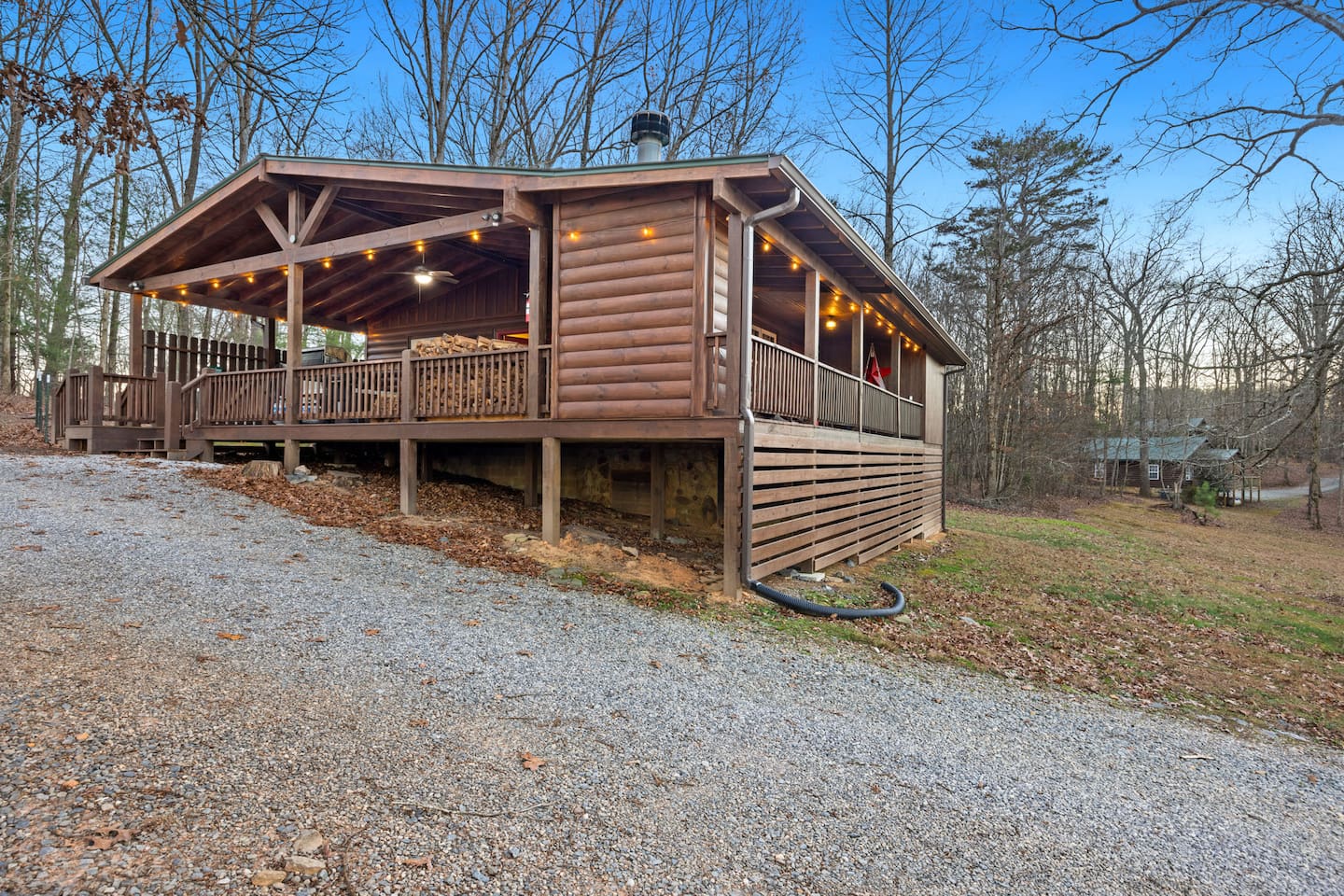 **Outdoor Living:** Expansive wraparound covered porch with a wood-burning fireplace (firewood included), gas grill (propane included), and a 4-person hot tub.