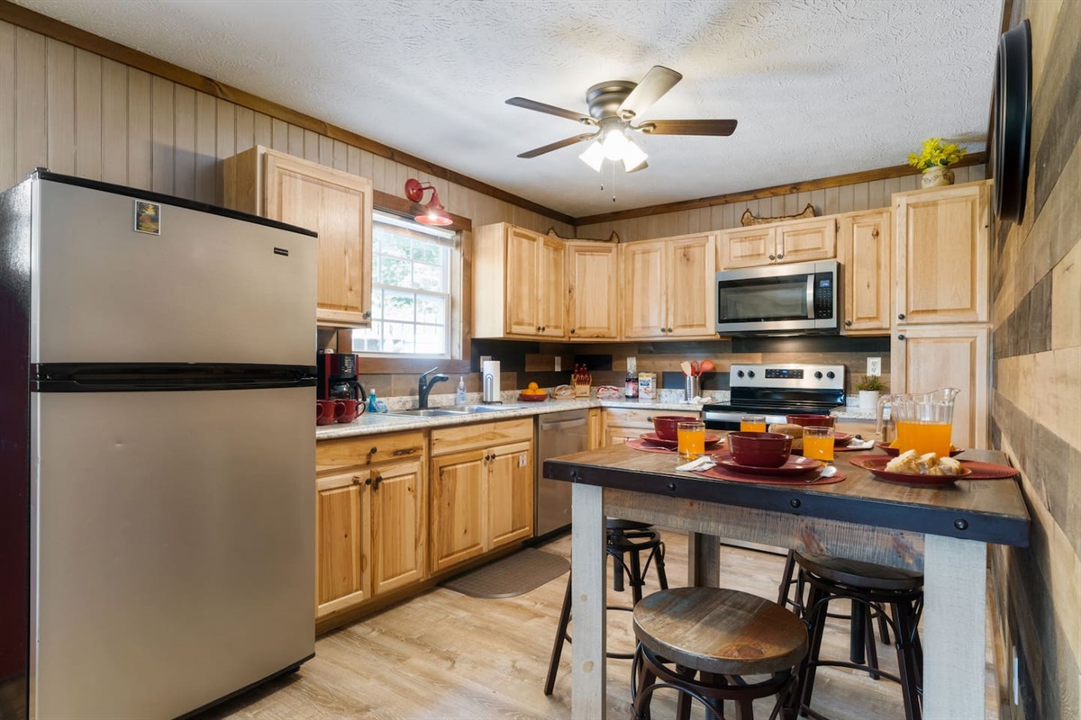 **Kitchen:** A fully stocked kitchen with stainless steel appliances, a drip coffee maker, and all necessary cookware. A starter set of coffee, tea, creamer, and snacks is provided.