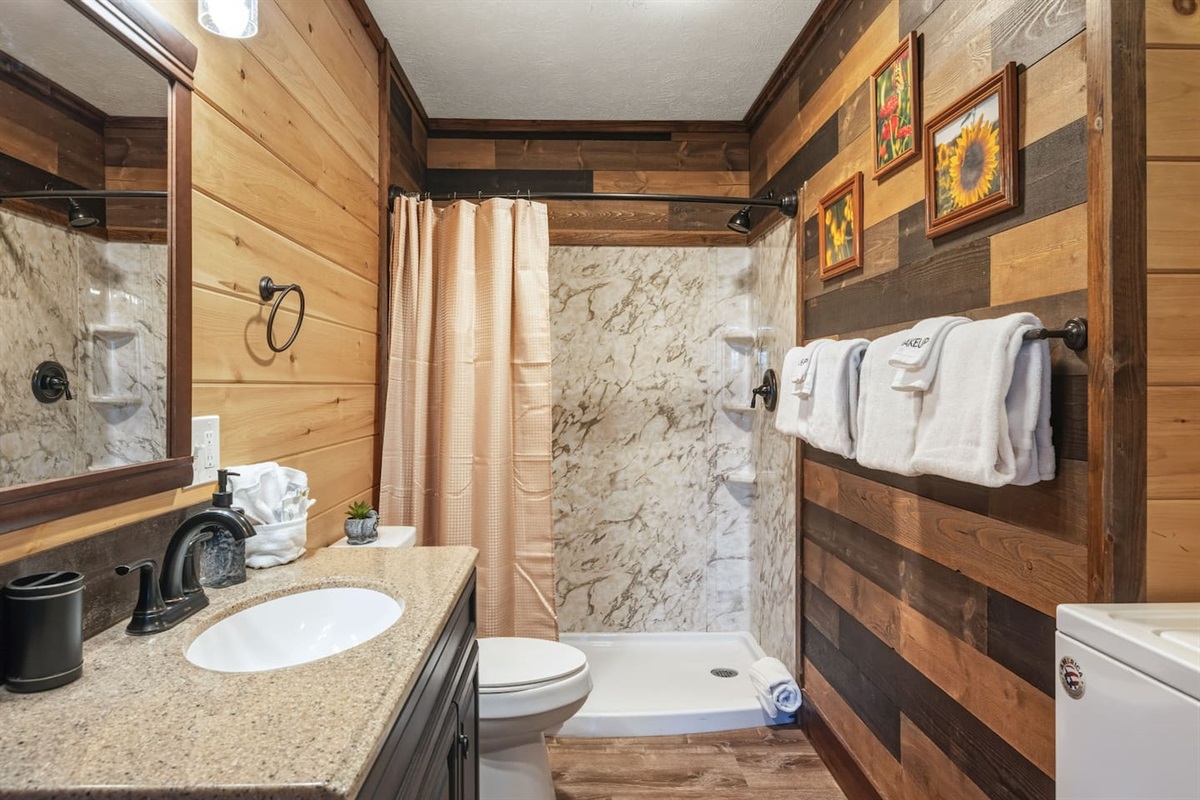 **Bathrooms:** Two full bathrooms. The ensuite has a tub/shower, and the second bathroom offers a walk-in shower. Both are supplied with fluffy towels, a hair dryer, and starter toiletries.