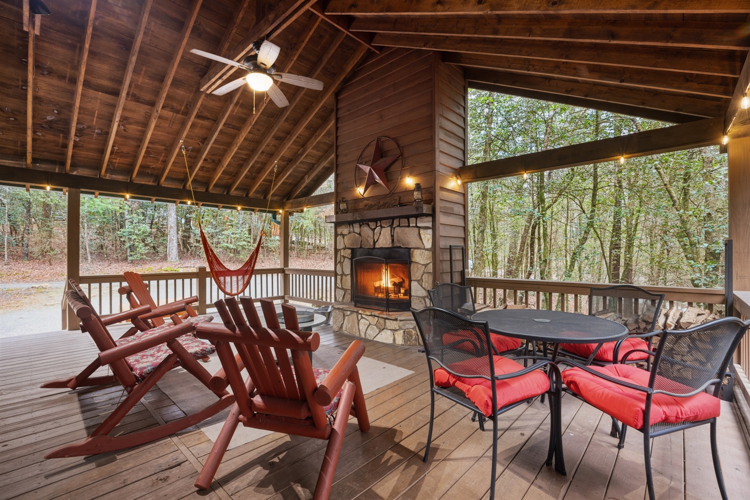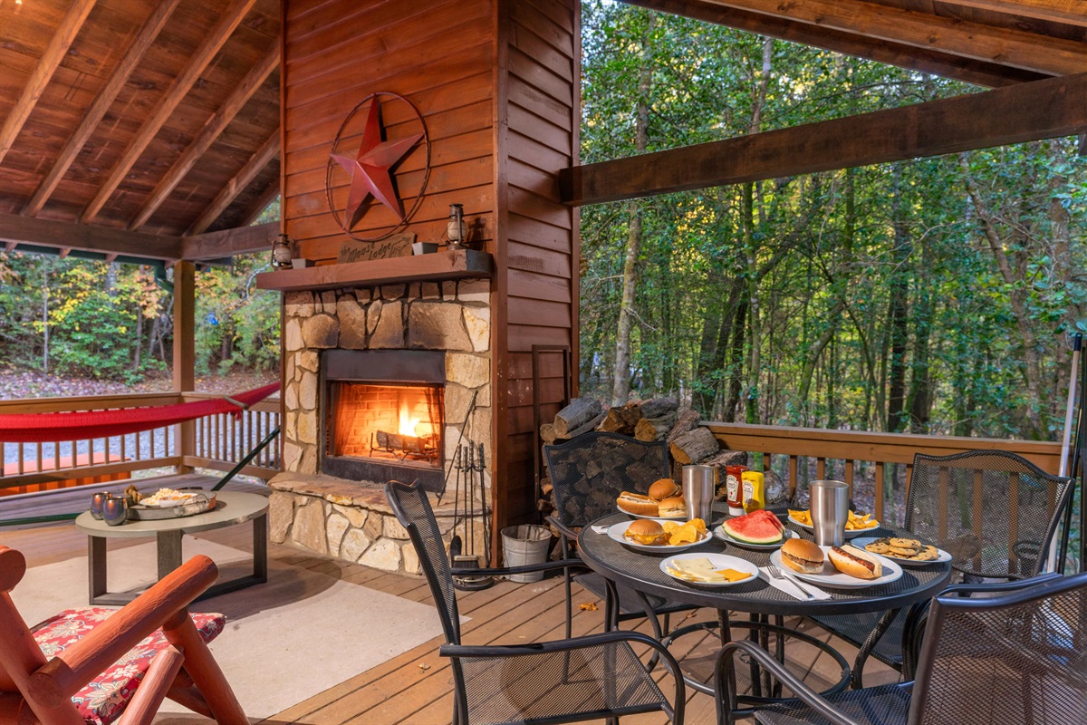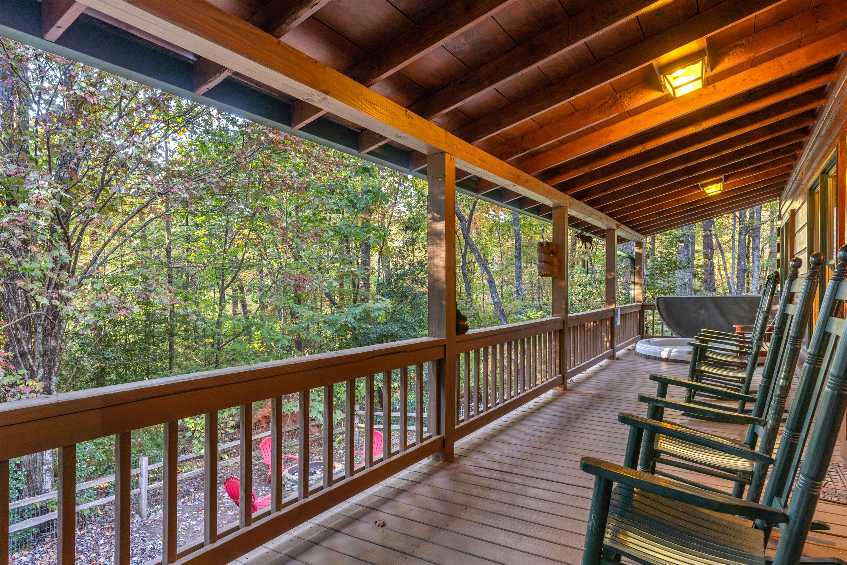 The star of the home is the breathtaking outdoor fireplace on the covered porch. It’s the perfect venue for your evening glass of wine and conversation. Experience your cares slip away when you relax in the wooden rockers overlooking the dense trees or soak in the outdoor hot tub!