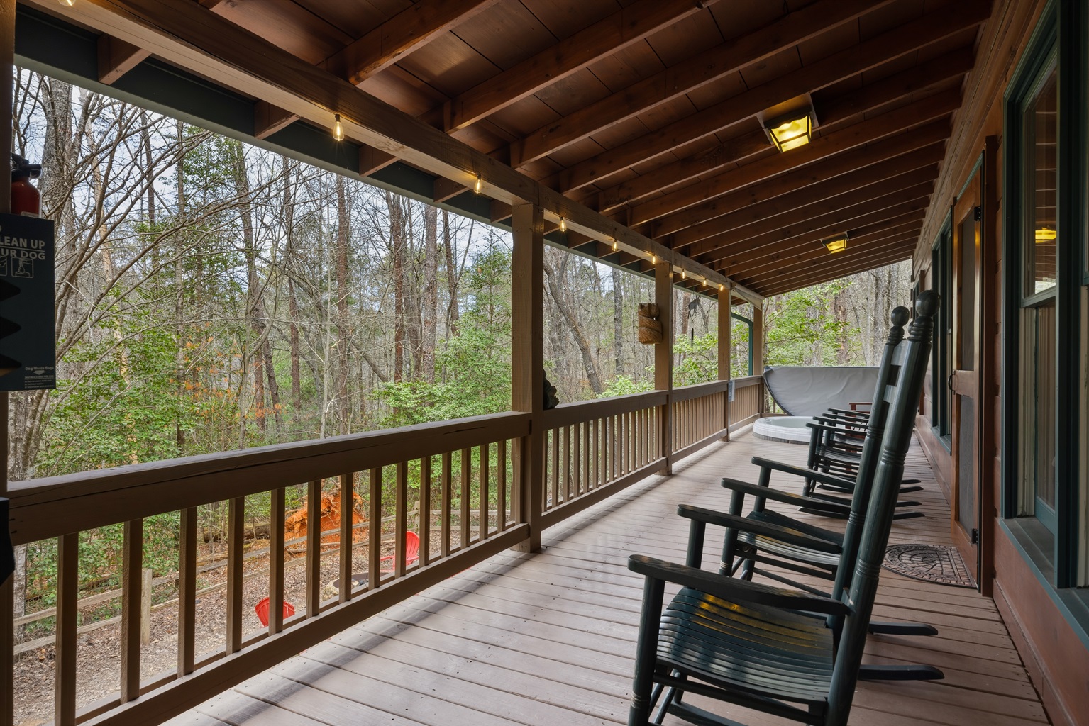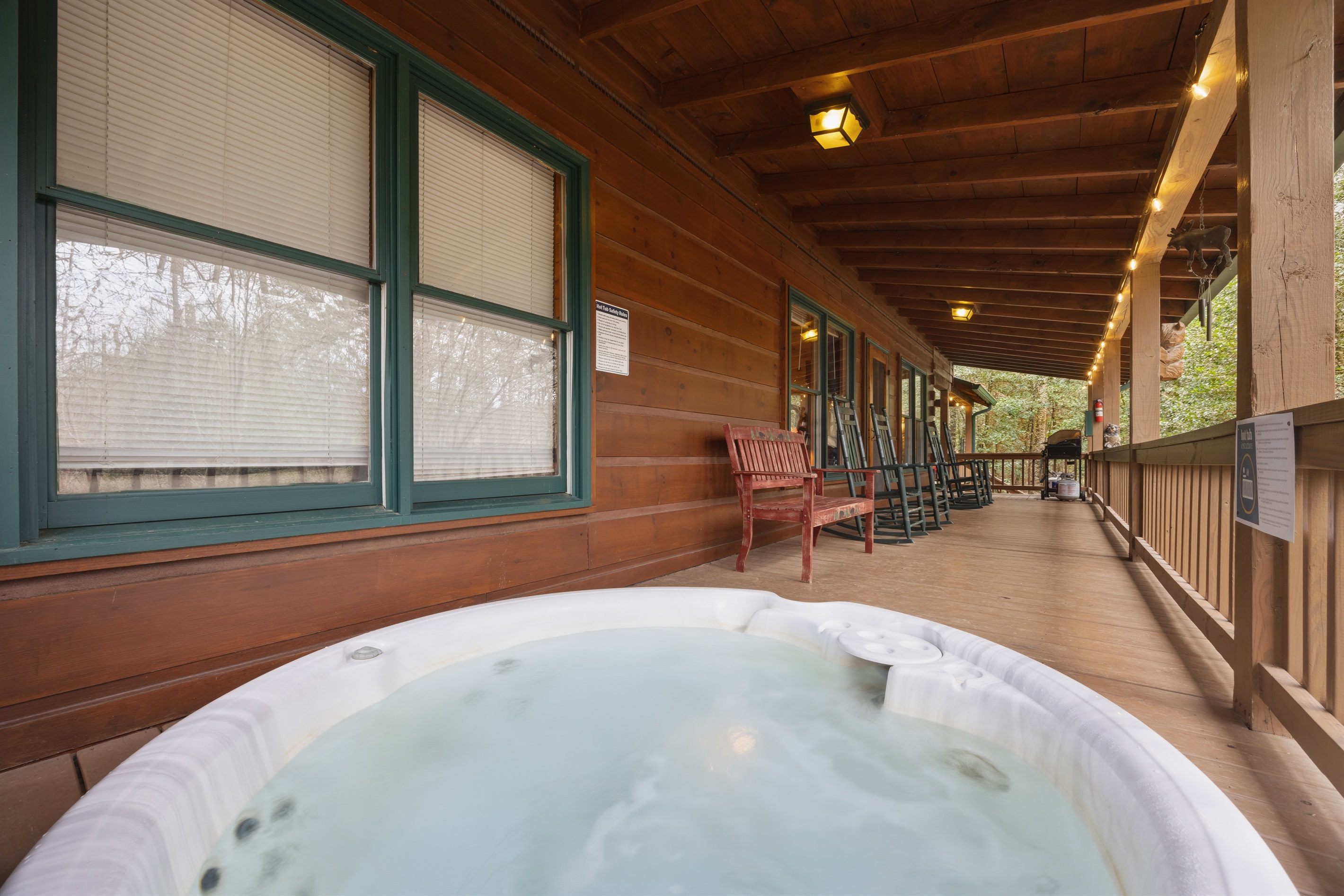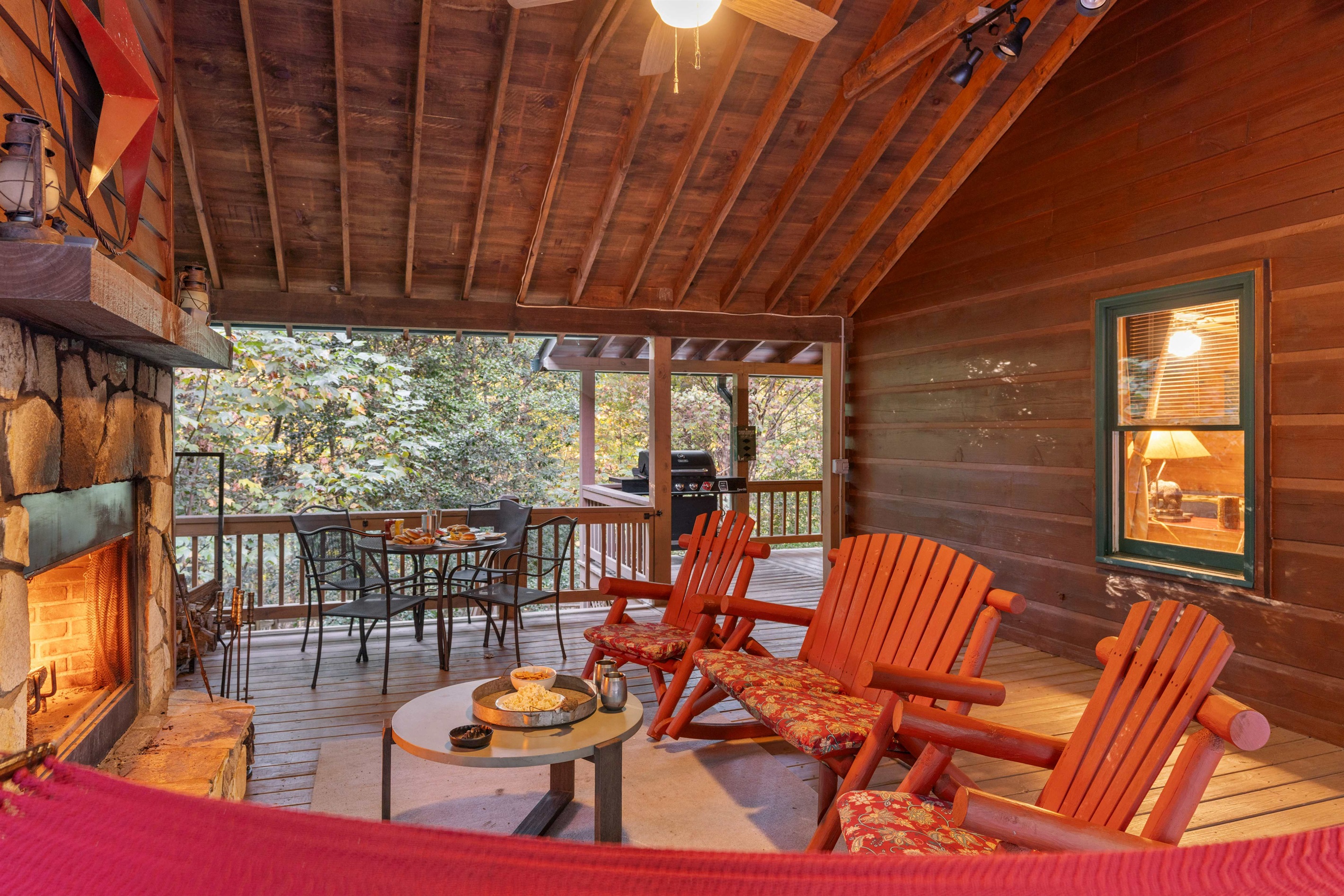 The star of the home is the breathtaking outdoor fireplace on the covered porch. It’s the perfect venue for your evening glass of wine and conversation. Experience your cares slip away when you relax in the wooden rockers overlooking the dense trees or soak in the outdoor hot tub!