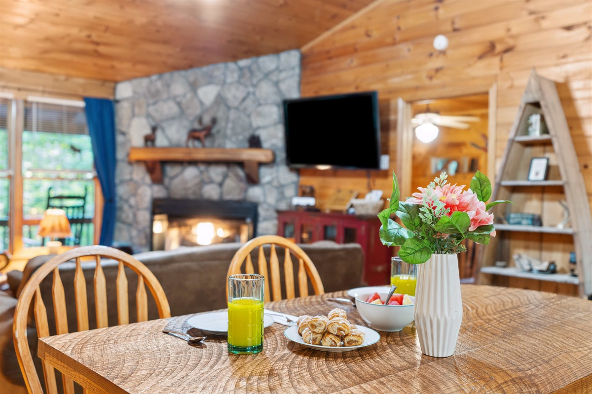 The spacious and fully-equipped kitchen with island and bar stools make cooking a social affair. Tuck into your homemade meal at the large dining table. The open floor plan helps keep the conversation going thanks to an unobstructed view of the living room. Decorated with comfortable furniture, a large gas fireplace, and a flat-screen TV, the living room invites you to kick back to a good book, or catch up on your favorite digital entertainment. The WiFi is reliable and fast!