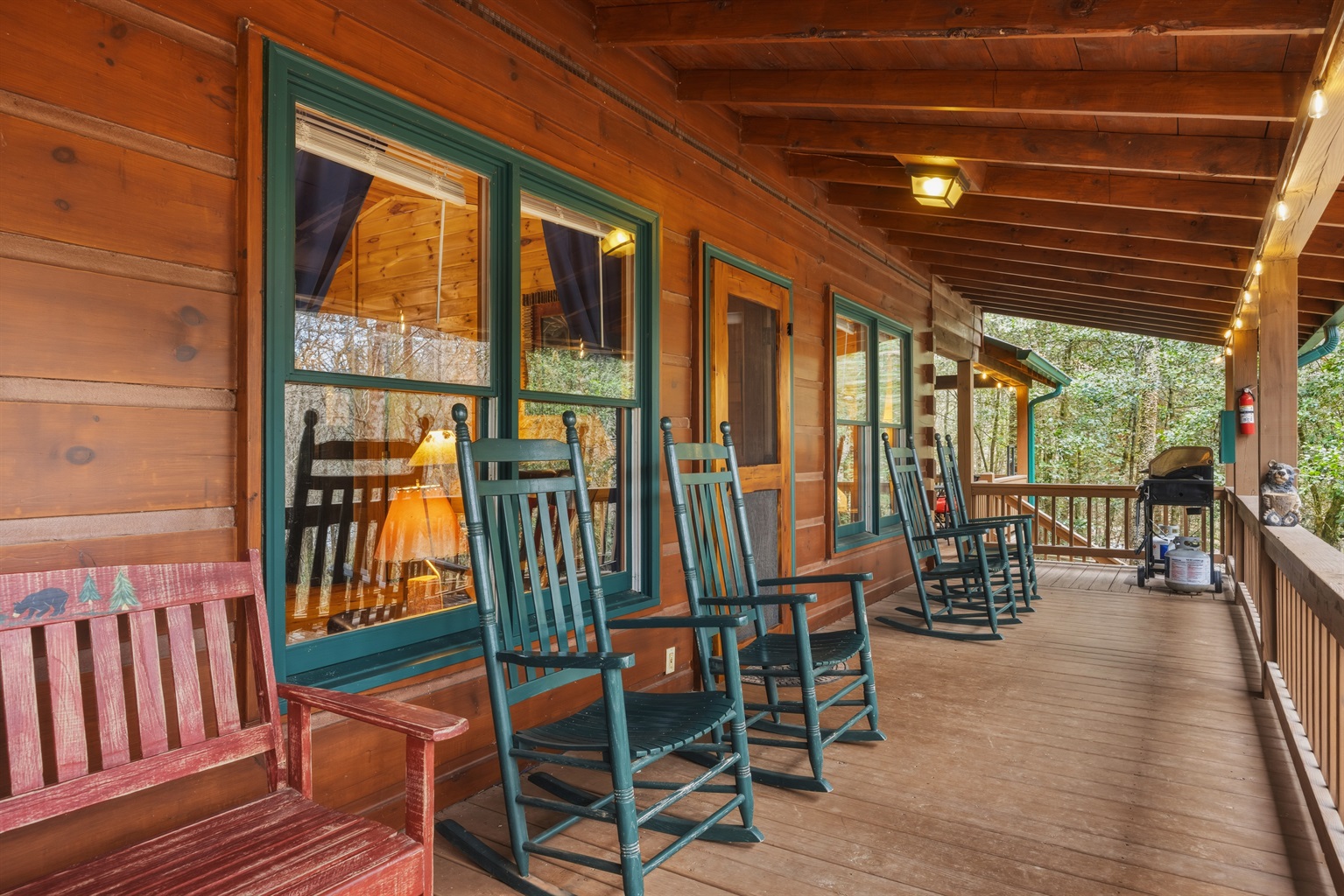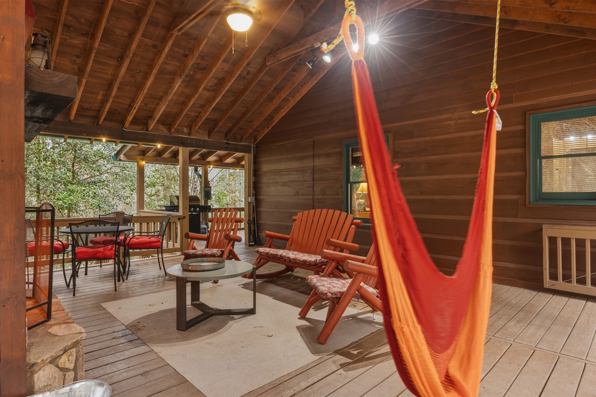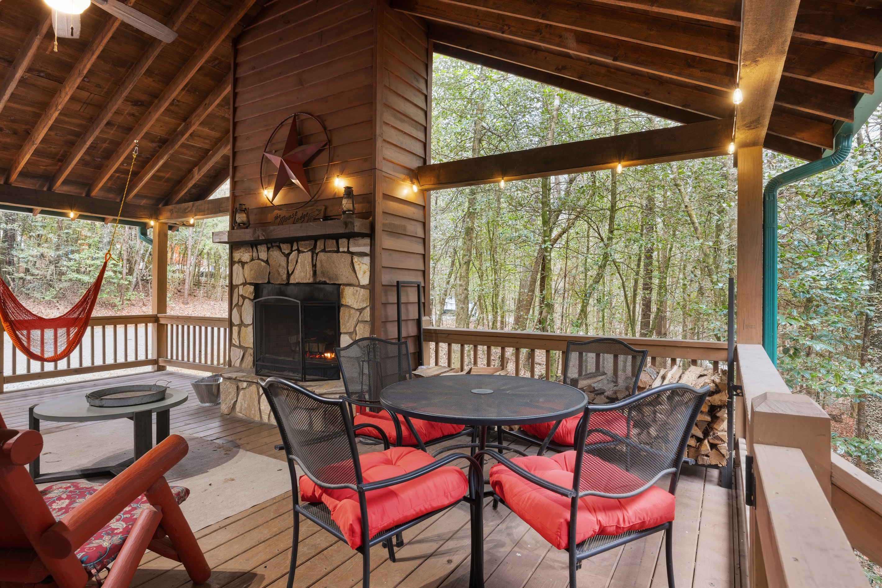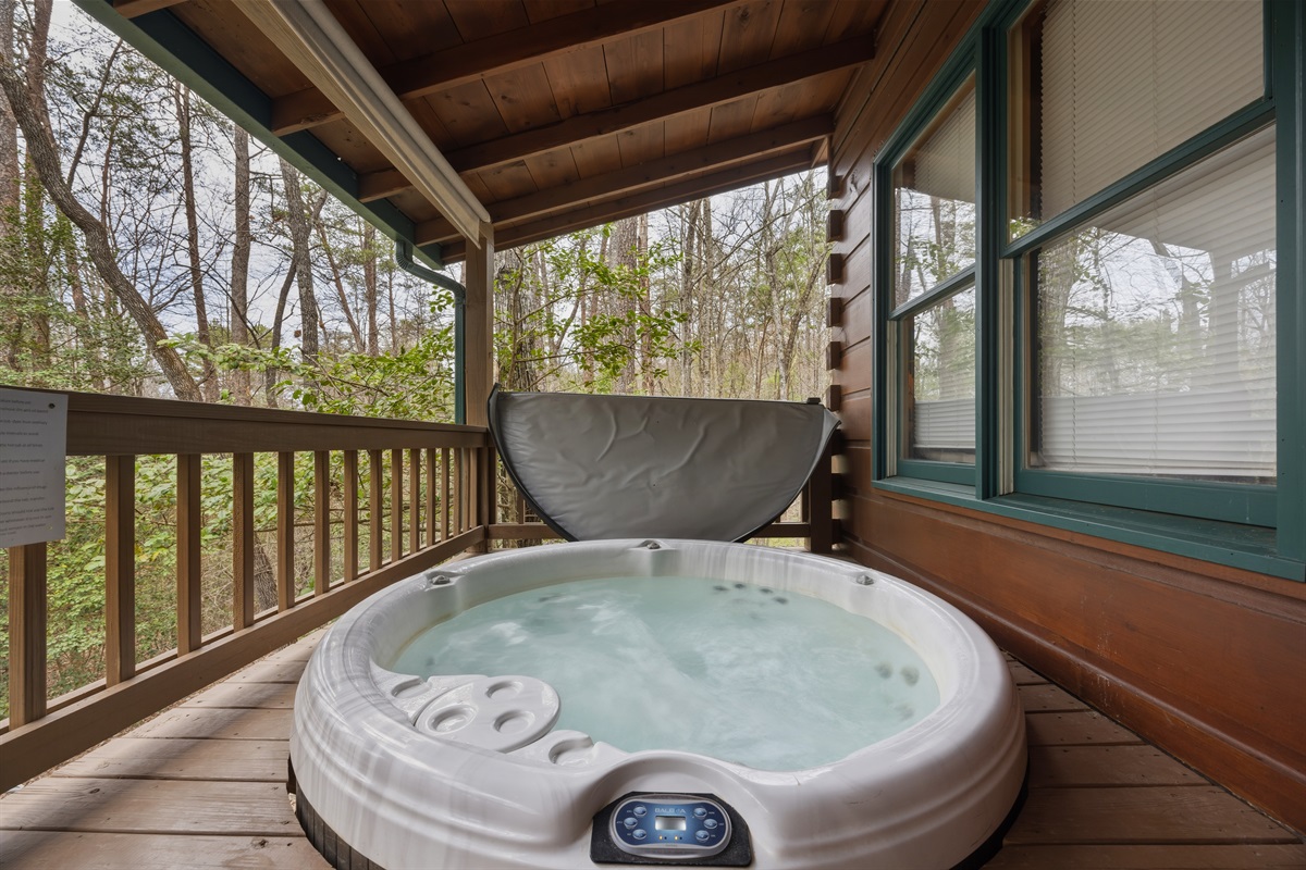 The star of the home is the breathtaking outdoor fireplace on the covered porch. It’s the perfect venue for your evening glass of wine and conversation. Experience your cares slip away when you relax in the wooden rockers overlooking the dense trees or soak in the outdoor hot tub!