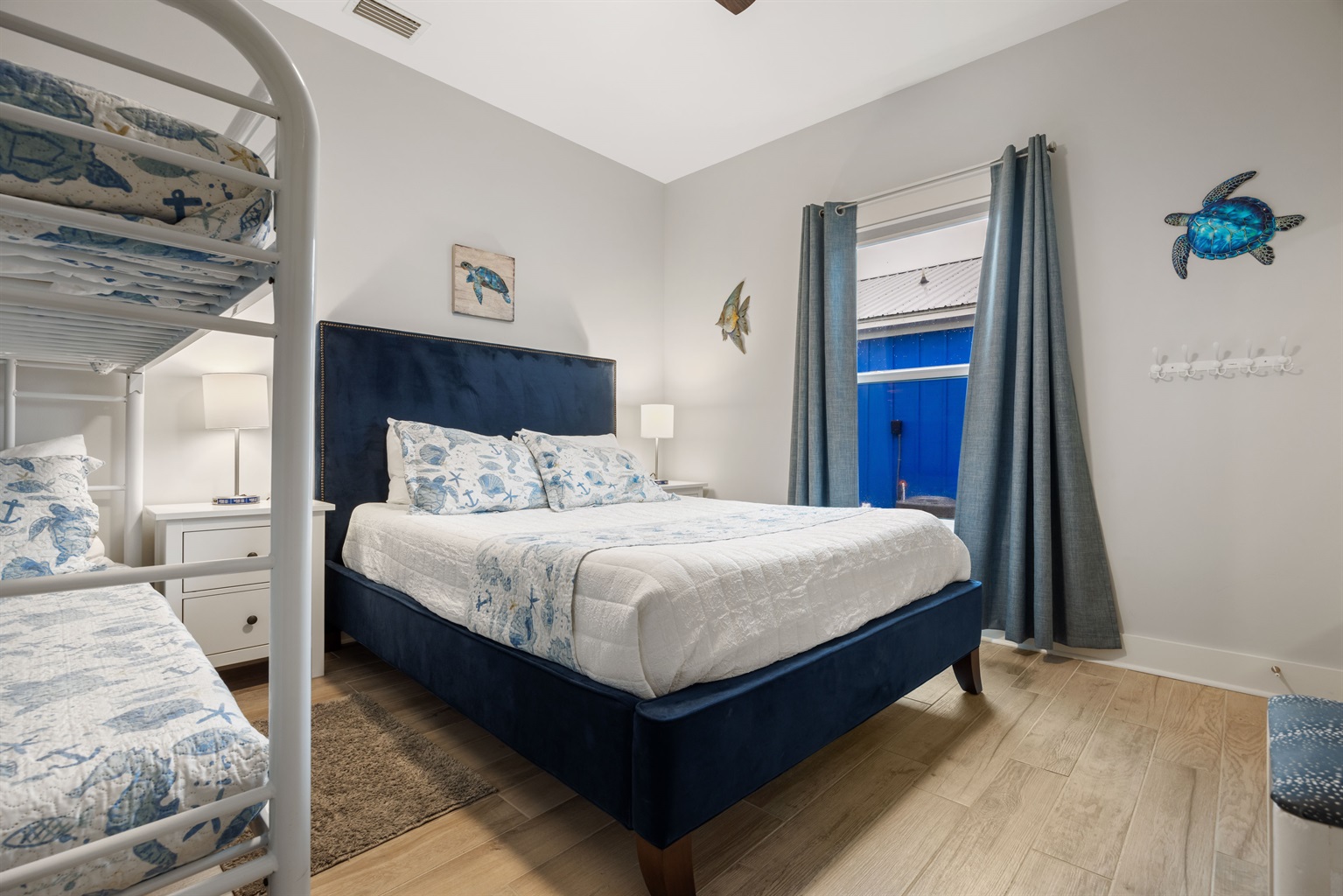 * Bedroom 4: Queen bed, a bunk bed, blackout curtains, and a TV.